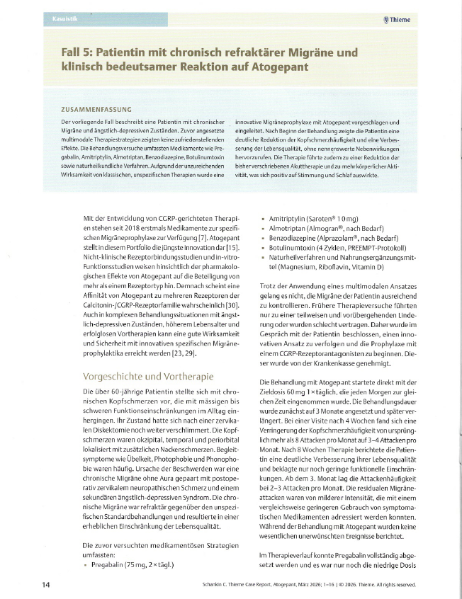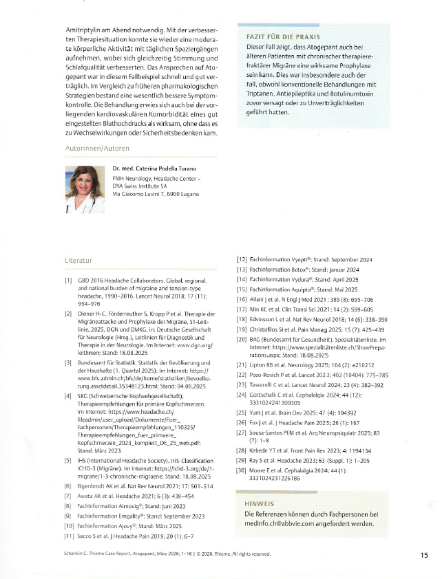DYA Swiss Institute SA ha pubblicato un caso clinico all’interno di una raccolta internazionale dedicata ad atogepant, edita da Thieme e promossa da AbbVie. Il contributo scientifico, firmato dalla Dr.ssa Caterina Podella, FMH Neurologia – Headache Center, descrive la gestione di una paziente affetta da emicrania cronica refrattaria, con una significativa compromissione della qualità di vita e senza risposta a precedenti trattamenti farmacologici e multimodali.